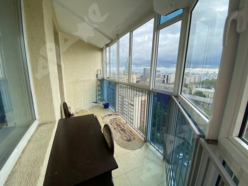 Большой балкон, уровень которого 19 этаж с видом на весь город.