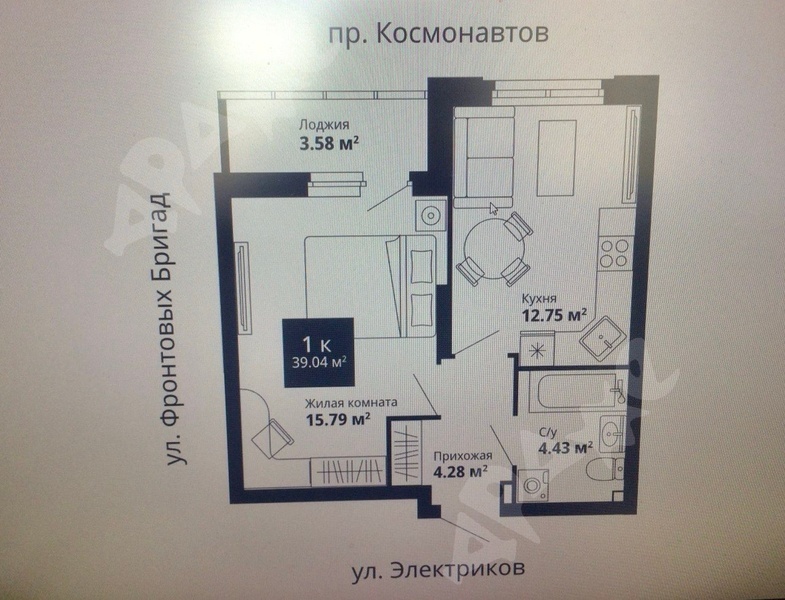 Площадь квартиры: 39.04 кв. м., (кухня 12.6 кв. м, жилая - 15.6 кв. м, просторная лоджия).
