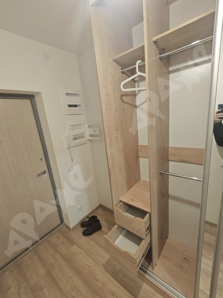 В квартире есть большая гардеробная, просторный балкон, кухня с гарнитуром, плита, стиралка, диван, столик, (если будет надо, привезу холодильник).