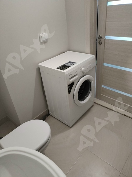 В квартире есть все необходимое: кухонный гарнитур, холодильник, стеклокерамическая плита, стол, стулья, диван, стиральная машинка.