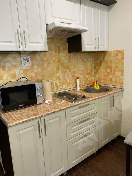 В квартире есть все необходимое для проживания: кухонный гарнитур, диван, стулья, стол, холодильник,стиральная машина, ванна, шкаф для вещей,микроволновая печь, двухкомфорочная плита,чайник.