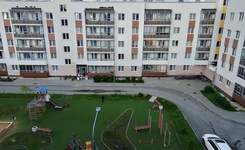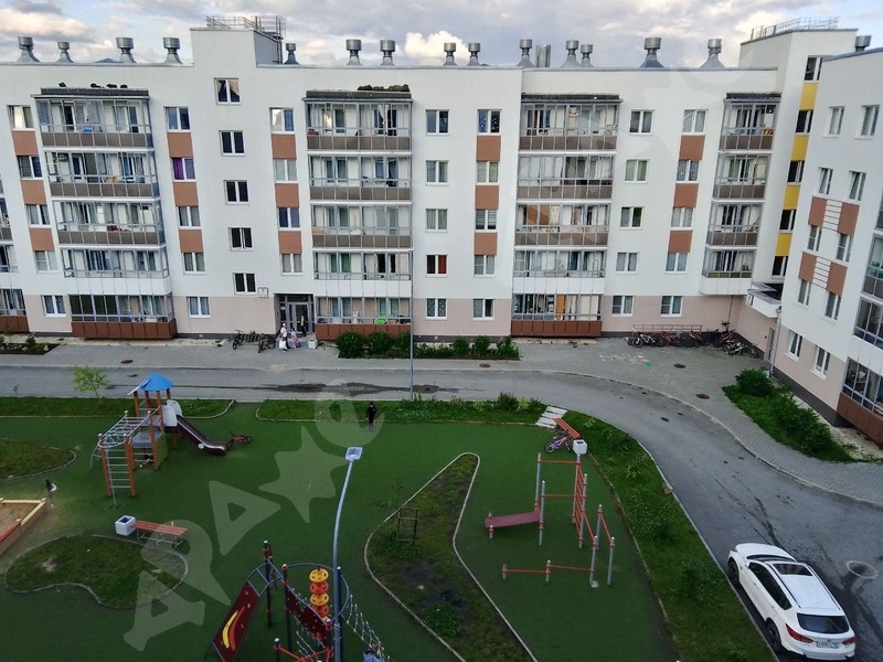 Чистый, закрытый двор. Детская площадка. Рядом автобусная остановка, новая школа и детский сад, большие продуктовые магазины.