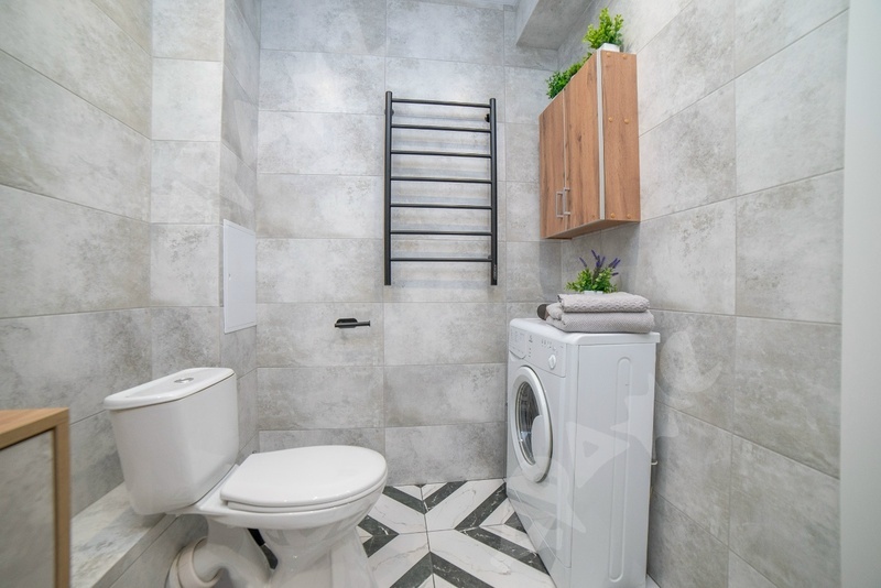 В квартире есть всё необходимое для комфортного проживания: удобная мебель на кухне и в комнате, а также вся необходимая техника — холодильник и стиральная машина. Санузел совмещённый, установлен современный душ.
