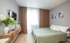 В квартире имеется вся необходимая мебель и техника для комфортного проживания: кухонный гарнитур, холодильник, духовка, индукционная плита, чайник, микроволновка, стиральная машина, вместительный шкаф, раскладной диван, утюг, пылесос, сушилка для белья, гладильная доска, посуда и столовые приборы.