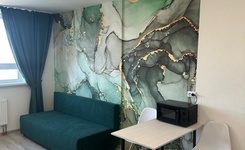 Есть вся необходимая мебель и техника: кровать с хорошим ортопедическим матрасом, вместительный шкаф, обеденный стол, стулья, холодильник, варочная поверхность с духовым шкафом. Шторы блэкаут. В ванной и коридоре теплый пол.