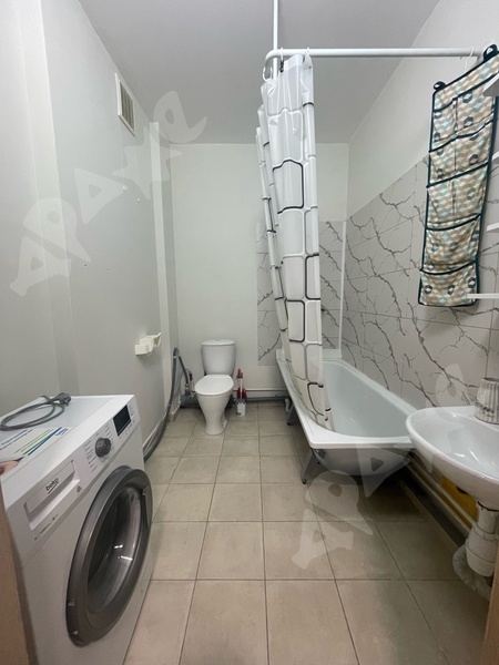 В квартире есть стиральная машина, мебель, плитка, микроволновая печь.