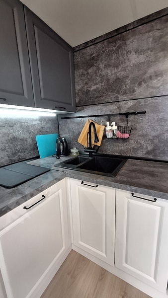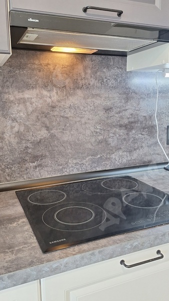 Из мебели все, что видите на фото.Из техники, стиральная машинка, посудомоечная машина,индукционная плита +духовой шкаф.