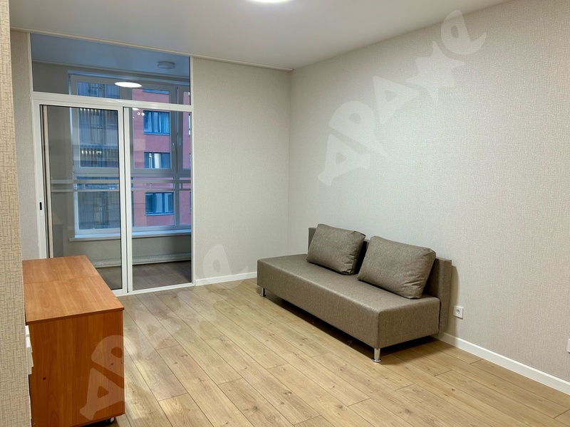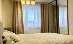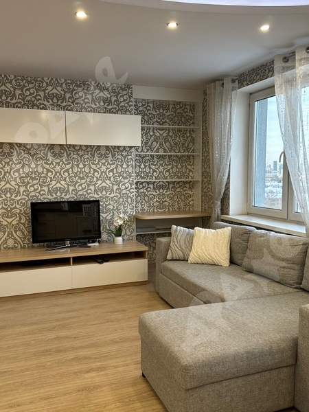 В пространстве гостиной особый уют создаёт панорамное окно с французским балконом. Дополнительно имеется застеклённая лоджия. Диван раскладывается - можно комфортно устроиться за просмотром кино на телевизоре с функцией SMART-TV.