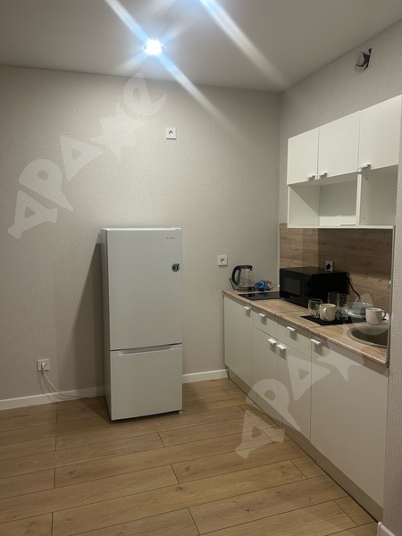 Кухня оборудована индукционной варочной панелью, встроенным духовым шкафом, микроволновой печью и электрическим чайником.