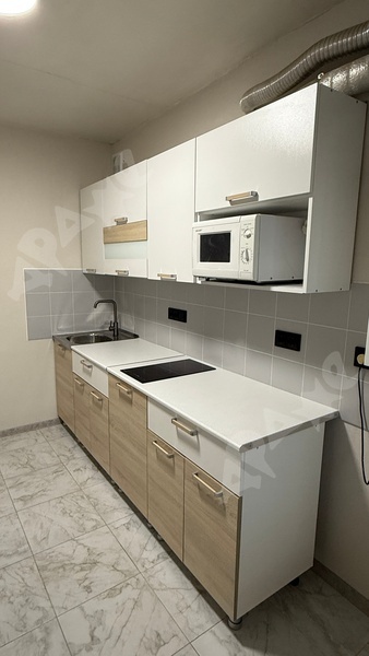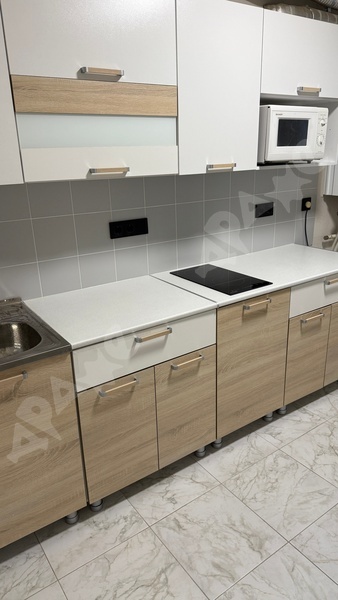 Кухня с отличным кухонным гарнитуром и современной встраиваемой бытовой техникой - варочная стеклокерамическая поверхность на 2 конфорки, микроволновка, холодильник, каменная мойка .