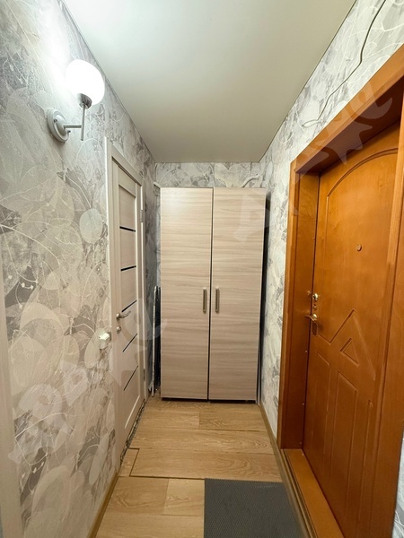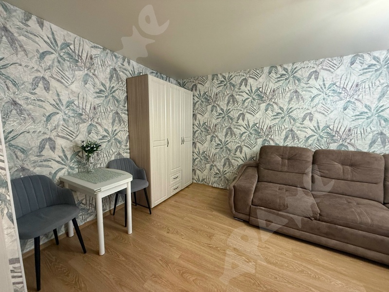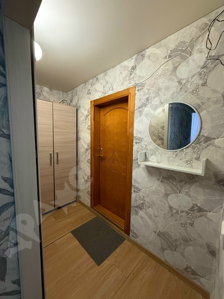 В квартире выполнен косметический ремонт, установлены шкафы и мебель для комфортного проживания. В комнате имеется удобный диван и письменный стол с креслом, а также шкаф для хранения вещей. Из мебели также предусмотрены вместительные шкафы в прихожей.