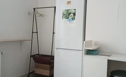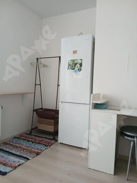 Студия полностью укомплектована: кухня, диван, стиральная машина, холодильник, электрический чайник и плитка.