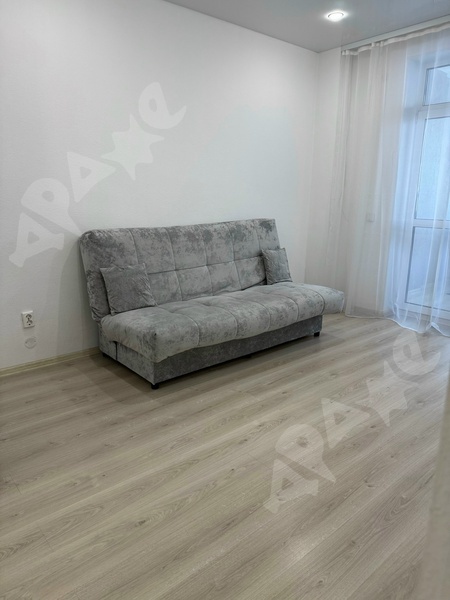 В пространстве гостиной особый уют создаёт панорамное окно с французским балконом. Дополнительно имеется застеклённая лоджия. Диван раскладывается - можно комфортно устроиться за просмотром кино на телевизоре с функцией SMART-TV.