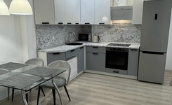 В квартире есть всё необходимое для проживания. Шкафы, кухонный гарнитур с посудомоечной машиной и электроплитой, холодильник, большой телевизор.