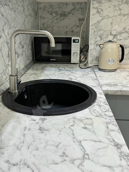 Кухня оборудована индукционной варочной панелью, встроенным духовым шкафом, микроволновой печью и электрическим чайником.