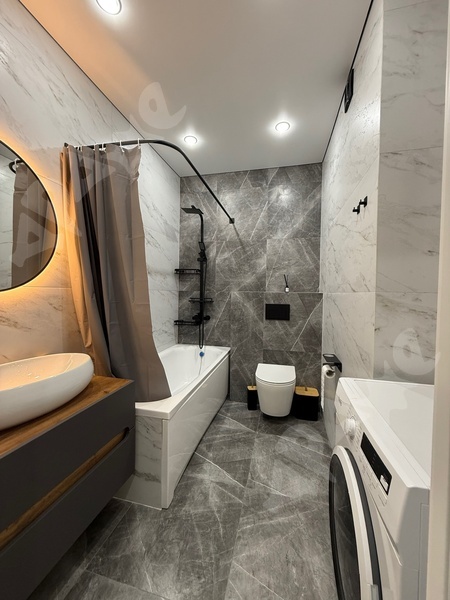 В ванной комнате находится стиральная машинка. Вся квартира чистая и ухоженная, здесь всегда приятно проводить время.
