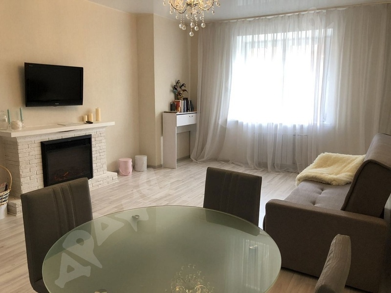В пространстве гостиной особый уют создаёт панорамное окно с французским балконом. Дополнительно имеется застеклённая лоджия. Диван раскладывается - можно комфортно устроиться за просмотром кино на телевизоре с функцией SMART-TV.