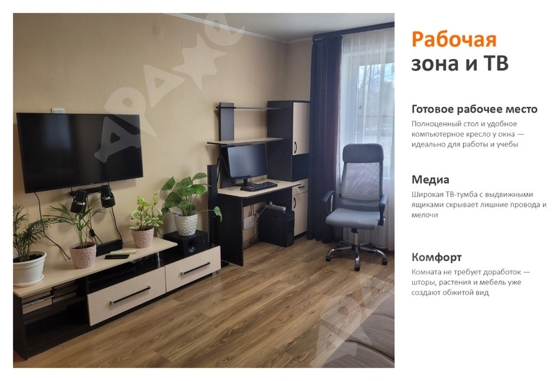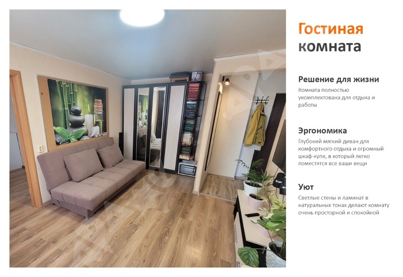 В гостиной (20м2): шкаф-купе во всю стену (4м), удобный диван, тумба под телевизор, низкий шкафчик, журнальный столик, сервировочный столик, напольный светильник, утюг и гладильная доска, сушилка. По запросу можем привезти письменный стол.