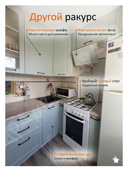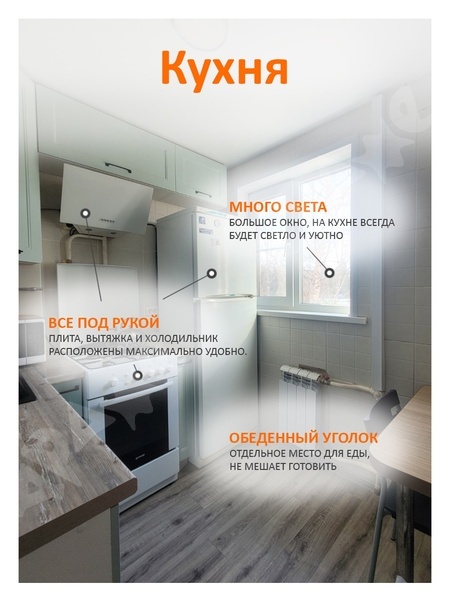 • Мебель: шкаф для одежды, диван, телевизор, кухонный гарнитур, кухонный стол и стулья.