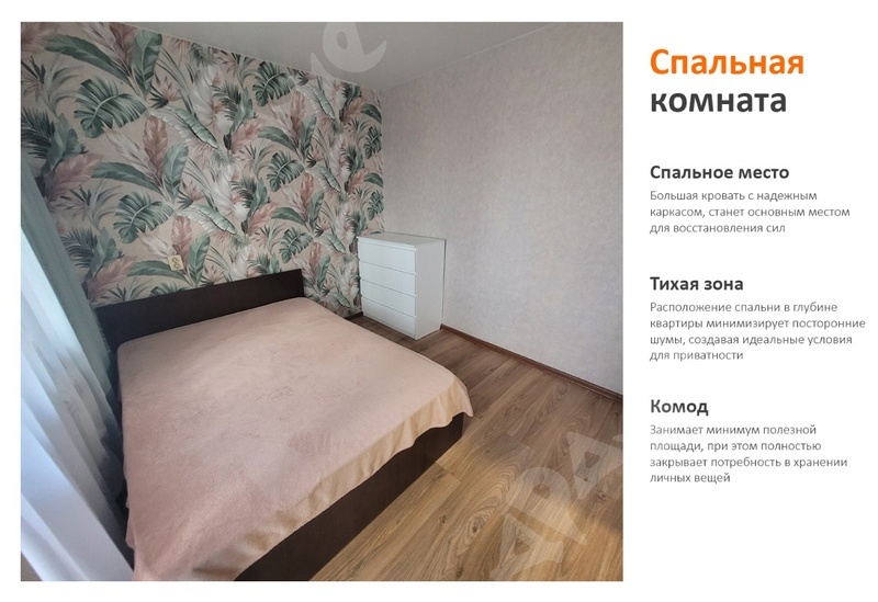 В спальне (8м2): вместительный шкаф, двуспальная кровать с ортопедическим матрасом, компактный стеллаж, косметическое зеркало с подсветкой.