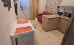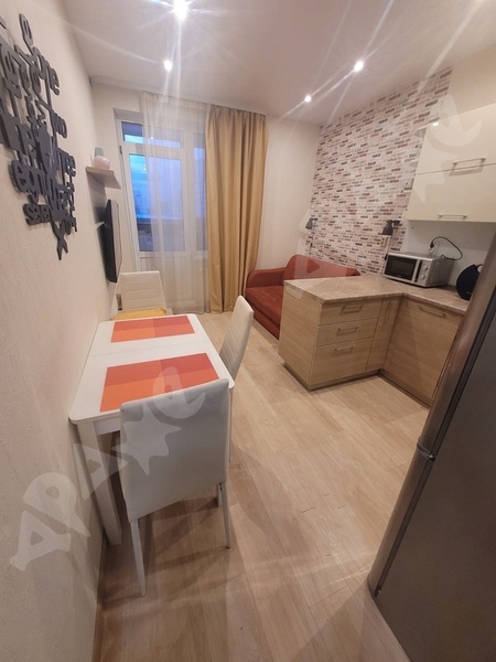 Площадь квартиры 38 кв. м., этаж 11/16. Из мебели кухонный гарнитур, холодильник, эл. плита (с духовкой), стиральная машина, обеденный стол со стульями, в комнате шкаф. Квартира сдается на длительный срок. В шаговой доступности остановки общественного транспорта и магазины. Территория дома огорожена, большая детская площадка.