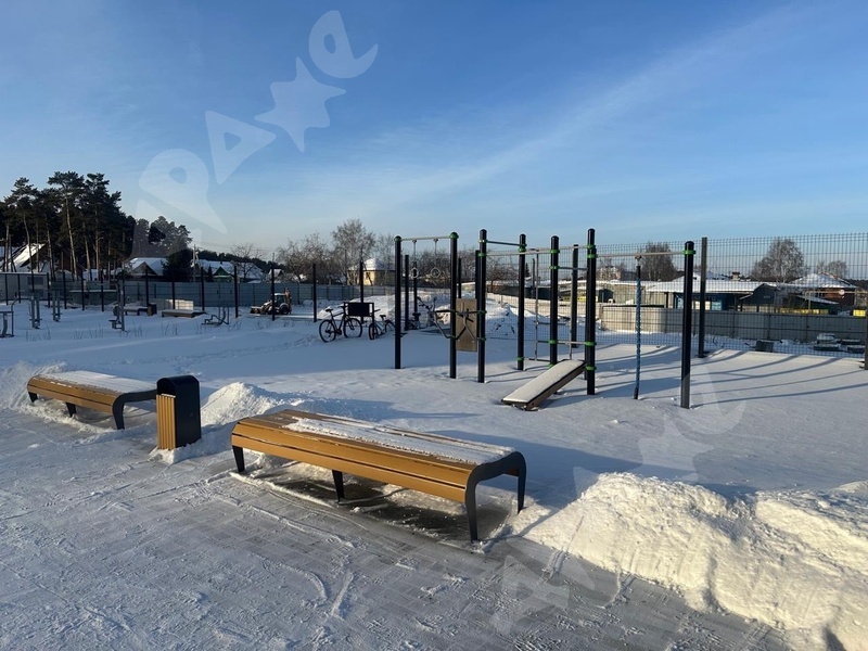 Благоустроенный двор с детскими площадками и спортивным кортом.