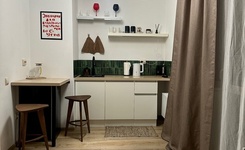 Студия полностью укомплектована : кухонный гарнитур с бытовой техникой, стиральная машина, душевая кабина, вместительные шкафы, рабочий стол, WiFi роутер.