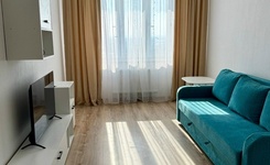 сдается уютная однокомнатная квартира на длительный срок площадью 45 кв м. Новый дом. В квартире никто не жил, сдается впервые. Расположена на 19 этаже, окна и балкон выходит на закрытую территорию во двор, где есть детская площадка. В квартире выполнен косметический ремонт. Комната-кухня ( можно сделать вариант евродвушки, площадь позволяет). Есть небольшой кухонный гарнитур ( имеются навесные шкафы), стол, стулья, холодильник, плита. Небольшая тумба и маленький телевизор. В комнате стоит диван( раскладывается, есть на него дополнительно топпер), комод, напольная вешалка, телевизор. Сан узел совмещен, имеется стиральная машинка.