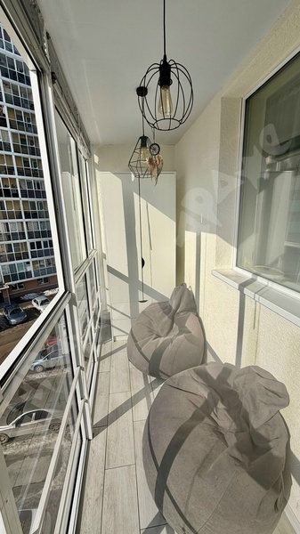 Балкон панорамный в стиле лофт, с ремонтом, плитка на полу, регулируется освещение, шкаф, жалюзи, кресла-мешки, розетки.