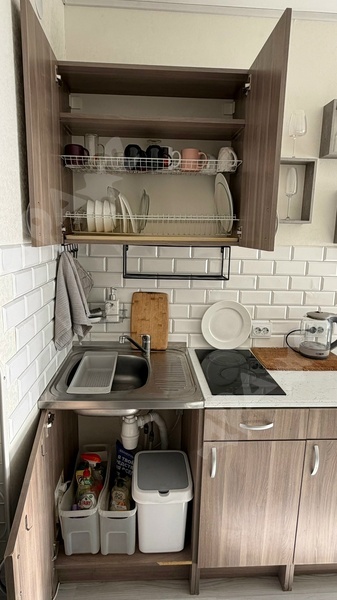 Просторная студия площадью 34 м² ждет вас! Внутри все готово для комфортной жизни: современная кухонная зона с холодильником и электрической плитой, двухспальная кровать, стол со стульями, наличие шкафа а также необходимые удобства — стиральная машина, утюг и сушилка для белья. Здесь есть все, чтобы вы могли просто зайти и жить!