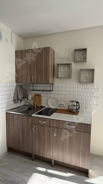 Установлена необходимая мебель и техника: раскладной диван, два шкафа, стеллаж, комод, кухонный гарнитур с варочной поверхностью, обеденная зона, холодильник с системой No frost, телевизор смарт 55 дюймов, микроволновая печь, электрический чайник, стиральная машина, кондиционер.
