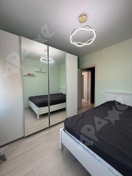 Площадь 50 кв. м, этаж 2/12, две изолированные комнаты, большой балкон, теплая квартира, ремонт косметический. Из мебели в спальне: большой шкаф, двуспальная кровать, прикованная тумбочка. В гостиной письменный стол со стулом, комод. Полностью оборудованная кухня с холодильником, посудомоечной машиной, микроволновой печью, чайником.