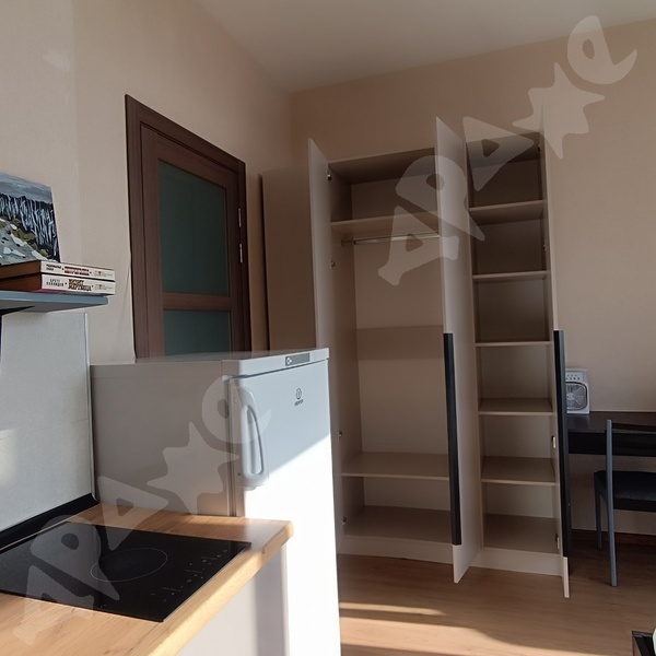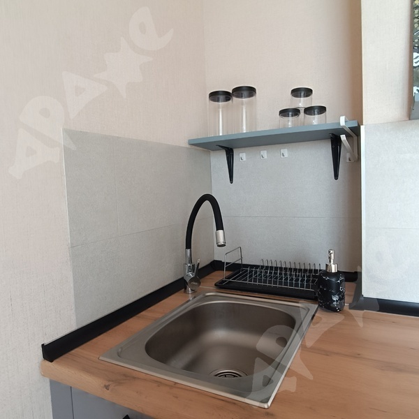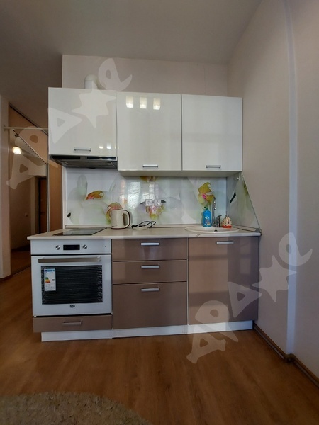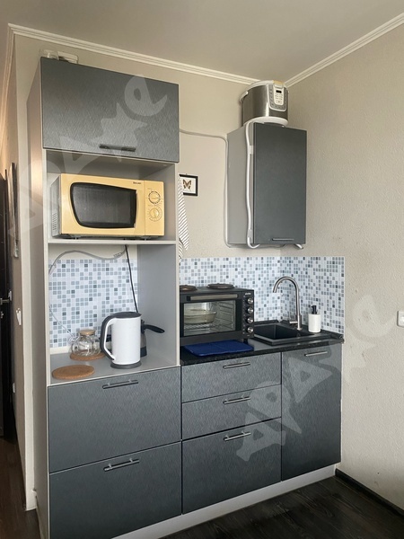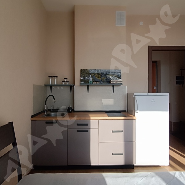 В студии есть все необходимое для комфортного проживания: кухонный гарнитур, холодильник, стиральная машина, диван.