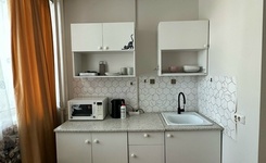 В студии есть все необходимое для комфортного проживания: кухонный гарнитур, варочная поверхность, духовой шкаф, вытяжка, холодильник, стиральная машина, диван, шкаф, стол, кондиционер, пылесос, посуда