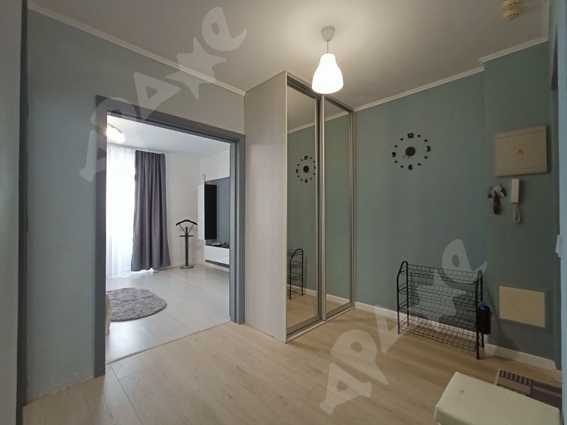 Полностью оборудованная кухня: гарнитур, плита с духовкой, холодильник. Диван, телевизор, стол со стульями, кухонный уголок — всё уже на месте. Вместительная прихожая со встроенным шкафом.