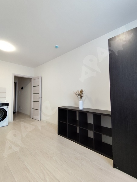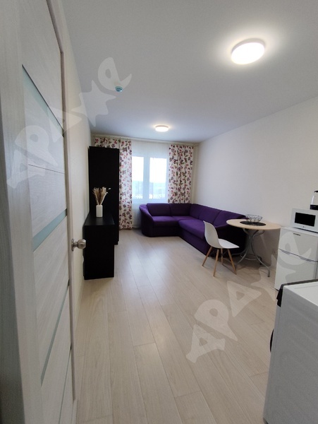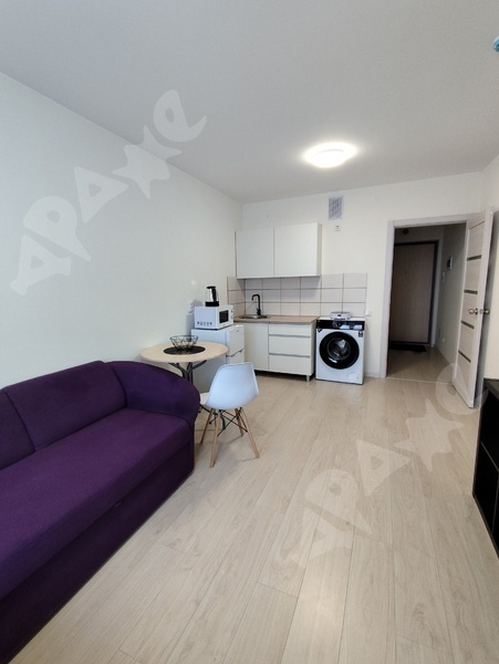 Сдам на длительный срок квартиру-студию улучшенной планировки в новом доме Студия поделена на зоны - отдельный сан узел, прихожая зона, отделенная дверью, зона кухни и комната. Квартира полностью мебелирована и готова к проживанию. На кухне установлен кухонный гарнитур с варочной панелью, двухкамерный холодильник, обеденный стол со стульями. В комнате диван-кровать, стенка для вещей, шторы блэкаут, в прихожей платянной шкаф. В ванной установлена душевая кабина и стиральная машина. В шаговой доступности находятся продуктивные магазины, пункты выдачи, автобусная остановка.