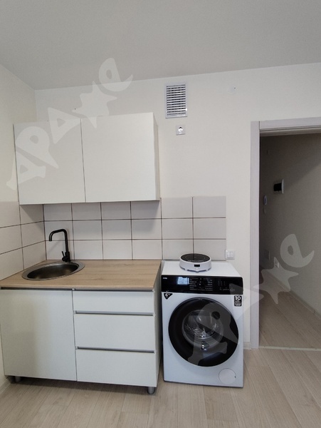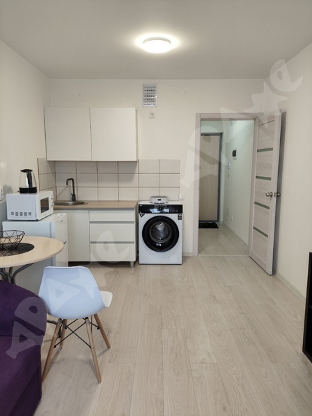 Студия. Площадь студии 22 кв.м, сан. узел 2,5 кв.м, балкона нет. Дом очень теплый, окна пластиковые, сделан косметический ремонт. Из техники: микроволновка, холодильник, плита, стиральная машина марки Bosch.