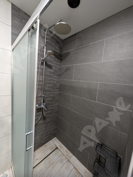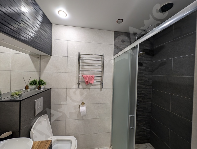 В сан. узле теплый пол, новая сантехника, стиральная машина, большая тумба под раковиной и шкаф над инсталляцией для удобства хранения вещей.