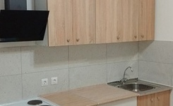 В квартире имеется мебель - кухонный гарнитур, вытяжка, стол, стулья;