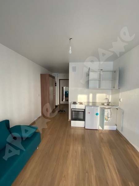 В студии есть все необходимое для комфортного проживания: кухонный гарнитур, холодильник, стиральная машина, диван.