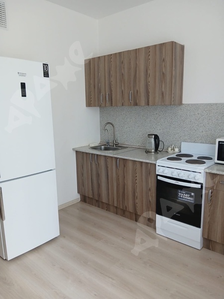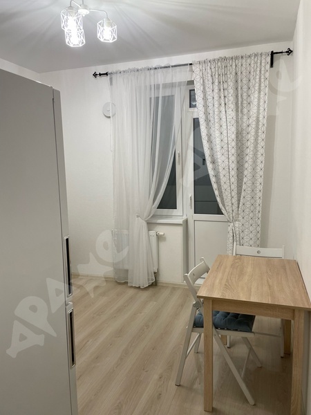 Площадь квартиры 38 кв. м., этаж 11/16. Из мебели кухонный гарнитур, холодильник, эл. плита (с духовкой), стиральная машина, обеденный стол со стульями, в комнате шкаф. Квартира сдается на длительный срок. В шаговой доступности остановки общественного транспорта и магазины. Территория дома огорожена, большая детская площадка.