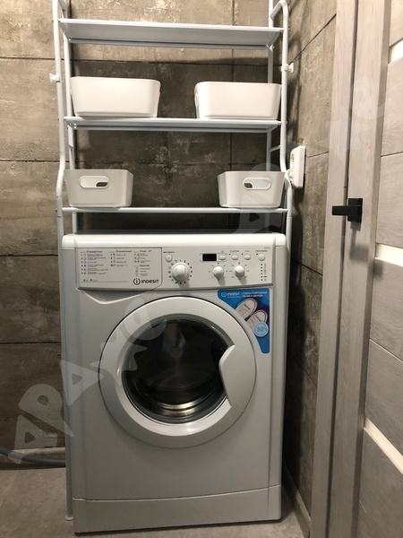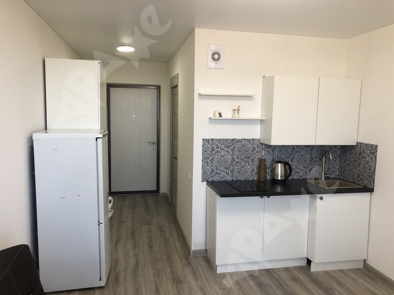 В студии есть все необходимое для комфортного проживания: кухонный гарнитур, холодильник, стиральная машина, диван.