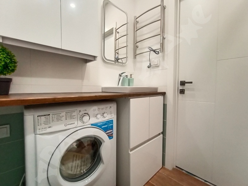 Просторная студия площадью 34 м² ждет вас! Внутри все готово для комфортной жизни: современная кухонная зона с холодильником и электрической плитой, двухспальная кровать, стол со стульями, наличие шкафа а также необходимые удобства — стиральная машина, утюг и сушилка для белья. Здесь есть все, чтобы вы могли просто зайти и жить!