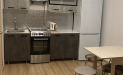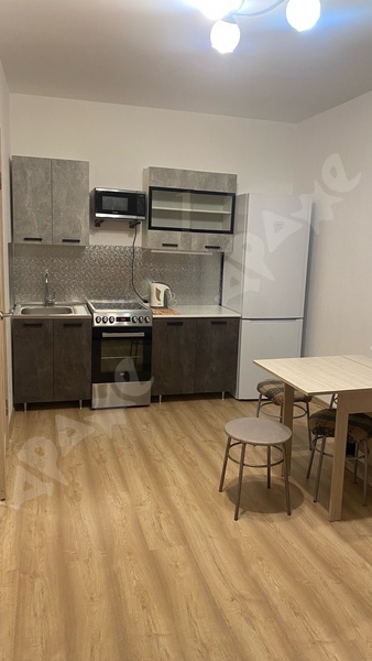 Площадь квартиры 38 кв. м., этаж 11/16. Из мебели кухонный гарнитур, холодильник, эл. плита (с духовкой), стиральная машина, обеденный стол со стульями, в комнате шкаф. Квартира сдается на длительный срок. В шаговой доступности остановки общественного транспорта и магазины. Территория дома огорожена, большая детская площадка.