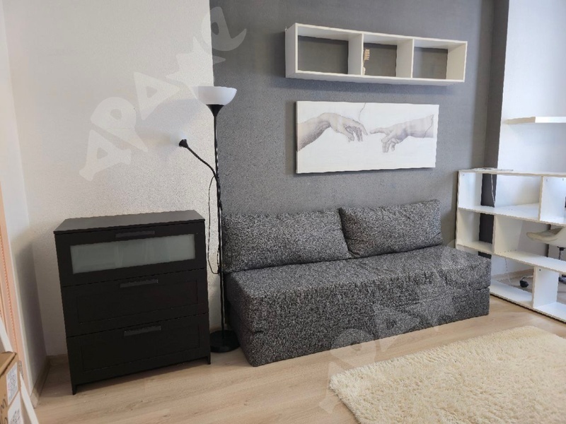 Квартира на 19 этаже с видом на парк; из мебели : кровать, стеллаж, кухонный гарнитур, диван, холодильник; все, что есть на фото + стиральная машина и микроволновка.
