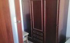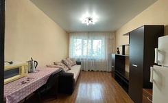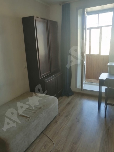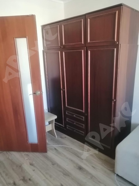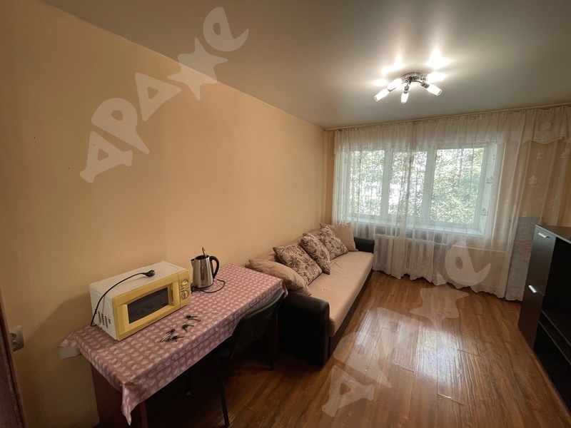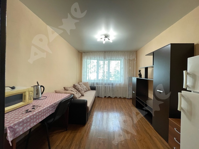 4 этаж. В комнате есть двухместный диван, шкаф, холодильник, СВЧ-печь, чайник, шкафы. Часть гарнитура на кухне.