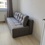 Есть большой диван, два кухонных шкафчика, стол.