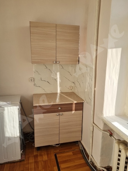 В комнате двуспальная кровать с матрасом, письменный стол, стул, вешало для одежды и полка. Холодильник, плита, кухонный гарнитур, стиральная машина в общем пользовании.