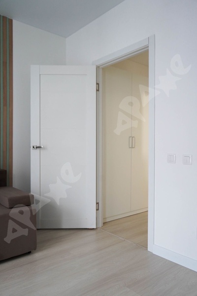 В комнате-ламинат, натяжные потолки, выполнено зонирование освещения. Также в комнате установлен воздуховод под натяжным потолком.
