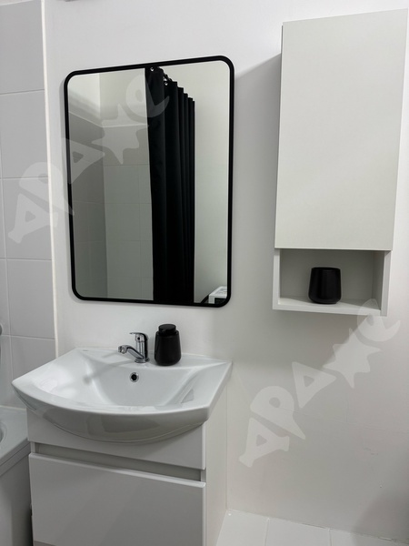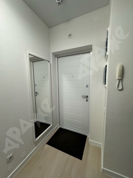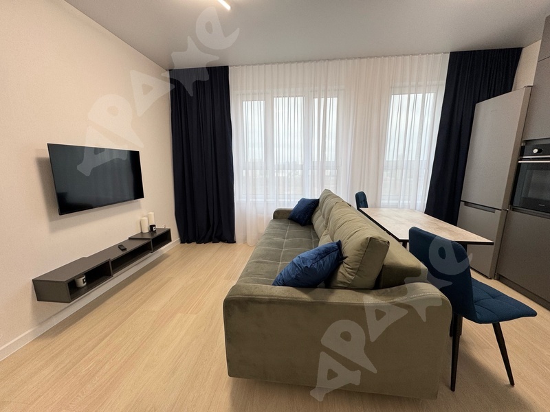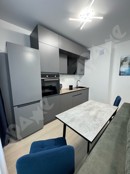 Площадь квартиры 25 кв.м, этаж 18/18, дом очень теплый , батареи зимой регулируются, большие французские окна. Квартира новая ,все как на фото. Из техники есть: стиральная машина, холодильник, вытяжка, плита и духовой шкаф; из мебели :диван, стол, стулья, вместительный шкаф в прихожей.